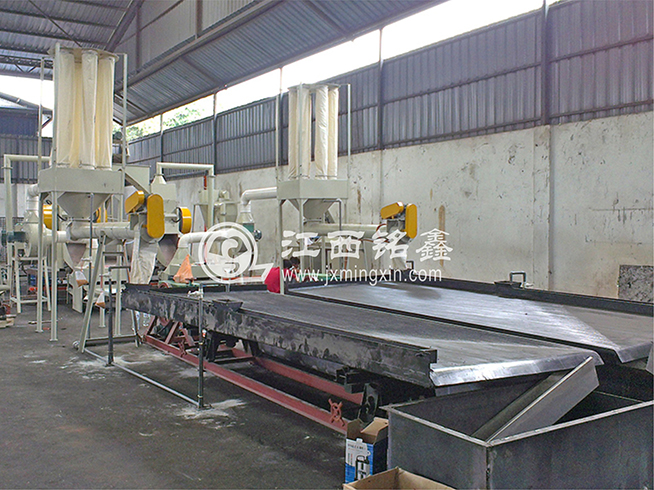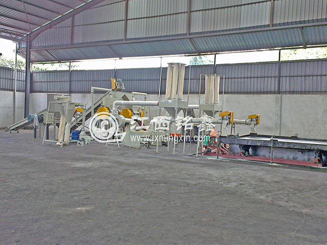 MX600型智能破碎機進行粗破 ---> 皮帶機輸送(磁選機除鐵) ---> MX500型干式銅米機細破(可加除塵系統) ---> MX1200型干式分選機分選出(粗、中、細銅米) ---> 風壓吸塑機將塑料(包含雜質和毛絲銅粉塵等)吸入聚料斗中 ----> 專用螺旋輸送 ---> 專用水選床水選